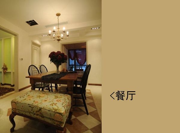 餐厅地面拼花跟餐桌相对应,墙面用米黄色乳胶漆精简整体空间