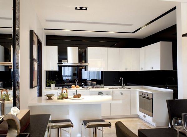 运用白色的橱柜对比黑色的烤漆玻璃墙面