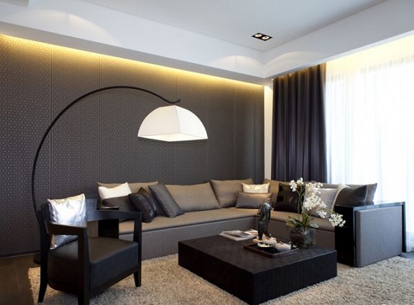 客厅电视背景采用米色大理石与深色地面让视觉产生反差效果